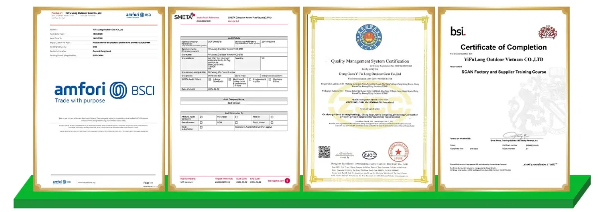 We have successively obtained a number of authoritative certifications,including ISO 9001 for quality management, BSCI/SMETA for social responsibility, and the Higg Index for environmental sustainability.
